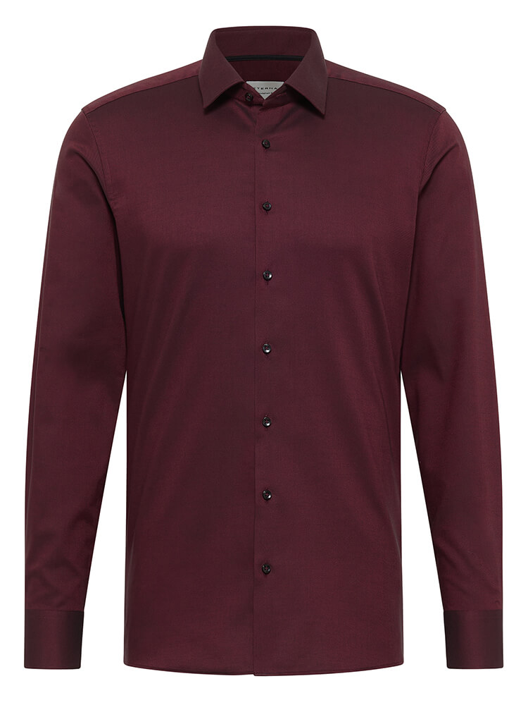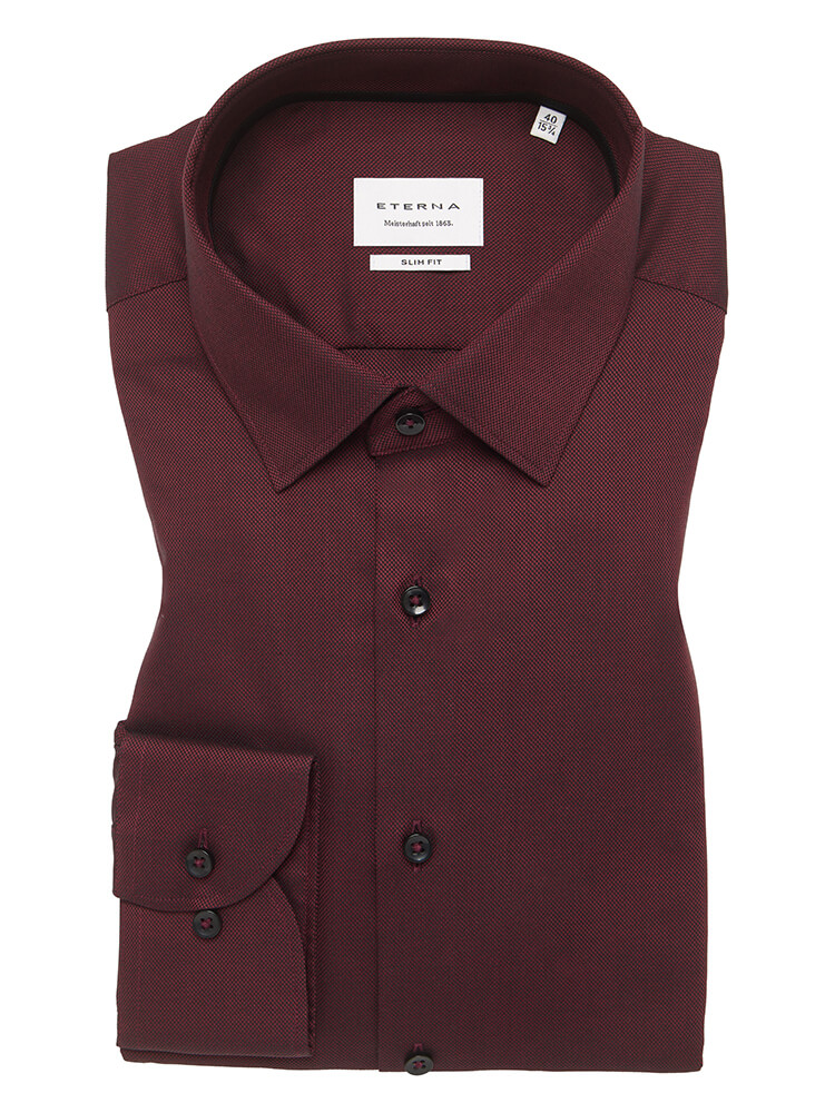 La camisa de negocios elegante de la colección ETERNA Slim Fit representa al hombre delgado y preocupado por la moda de hoy. Un corte delgado combinado con detalles de moda prometen un alto nivel de confort y hacen de esta camisa un artista de la combinación. La camisa lisa de hombre en el color rojo oscuro para hombre no debería faltar en el armario de ningún hombre y puede llevarse con el cuello elegante y atemporal Kent para cualquier ocasión, así como en la vida cotidiana. Esta camisa de hombre ETERNA Slim Fit queda mejor con una corbata estrecha y un pequeño nudo de corbata.