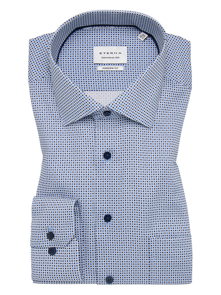 La camisa de negocios moderna de la colección ETERNA Modern Fit representa al hombre de hoy, seguro de sí mismo y a la moda. Un corte contemporáneo combinado con detalles de producto de primera calidad promete un alto nivel de comodidad y hace que esta camisa sea un maestro del arreglo. La camisa con dibujos de hombre en el color azul claro para hombre no debería faltar en el armario de ningún hombre y puede llevarse con el cuello distinguido y clásico Kent para cualquier ocasión, así como en la vida cotidiana. Esta camisa de hombre ETERNA Modern Fit queda mejor con una corbata a juego y un nudo de corbata ancho.