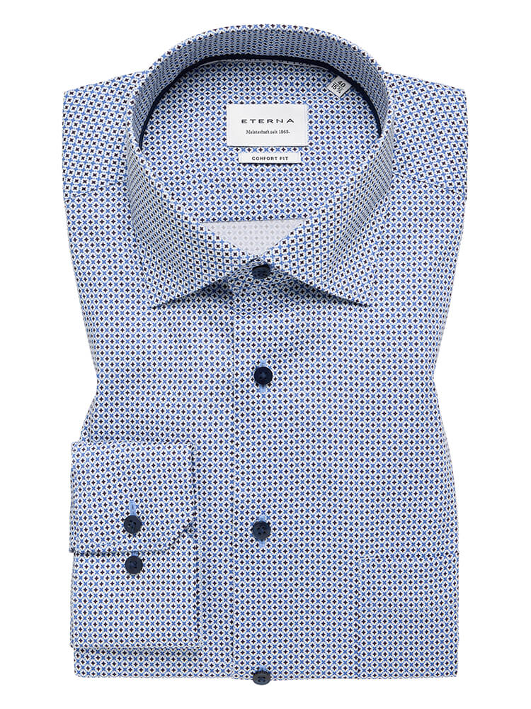 La camisa de negocios cómoda de la colección ETERNA Comfort Fit representa al hombre sofisticado y consciente de la moda de hoy. Un corte clásico combinado con detalles de moda del producto promete un alto nivel de confort y hace de esta camisa un maestro de la combinación. La camisa con dibujos de hombre en el color azul claro para hombre no debería faltar en el armario de ningún hombre y puede llevarse con el cuello elegante y atemporal Kent para cualquier ocasión, así como en la vida cotidiana. Esta camisa de hombre ETERNA Comfort Fit queda mejor con una corbata a juego y un nudo de corbata ancho.